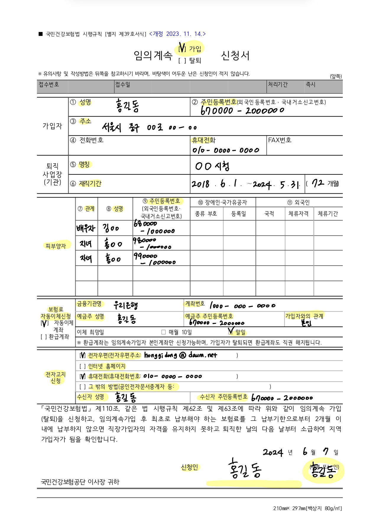 임의계속 가입자로 신청은 가입자 본인이 "임의계속가입 신청서"를 작성하여 건강보험공단에 제출하시면 됩니다. 해당지역 관할 건갑오험 지사에 방문해 신청하시거나 팩스, 우편, 유선으로 신청할 수 있습니다. 하단에 임의계속 가입자 신청서 예시를 제시하였으니 아래와 같은 방식으로 작성하여 건강보험공단에 제출하시기 바랍니다.
